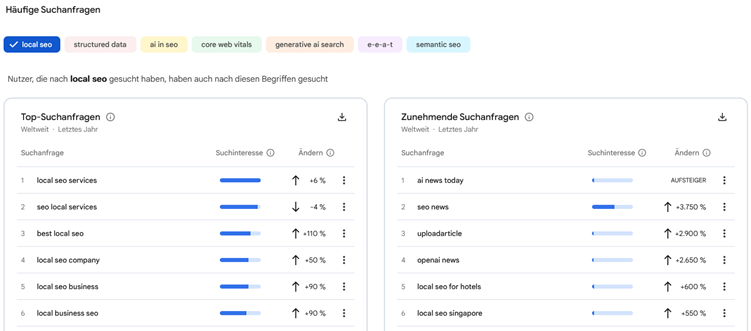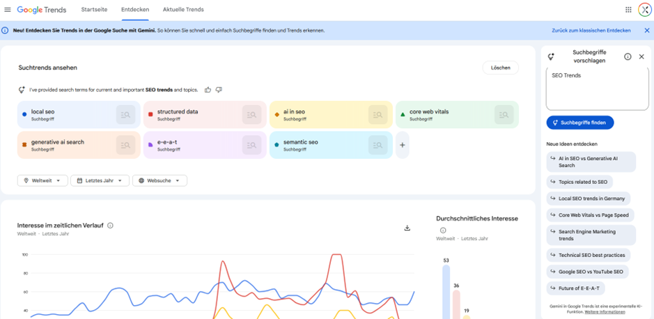 Google Trends hat ein KI-Update erhalten und kann jetzt gewinnbringender für Keyword- und Themen-Recherchen verwendet werden. Die aktualisierte ‚Entdecken‘-Seite verfügt über eine neue Seitenleiste, durch die Gemini Suchbegriffe zu relevanten Themen und Trends vorschlagen und vergleichen kann. Zudem erhaltet Ihr personalisierte Prompt-Vorschläge, die bei vertiefenden Recherchen hilfreich sein können.