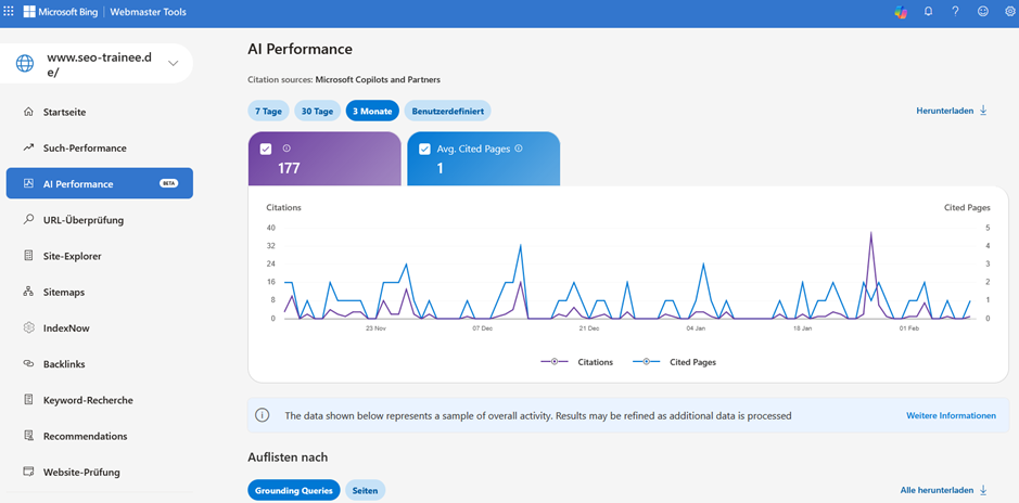- Zitationen (Citations): Anzahl der Erwähnungen der Website in KI-Antworten von Microsoft Copilot und dessen Partnern.